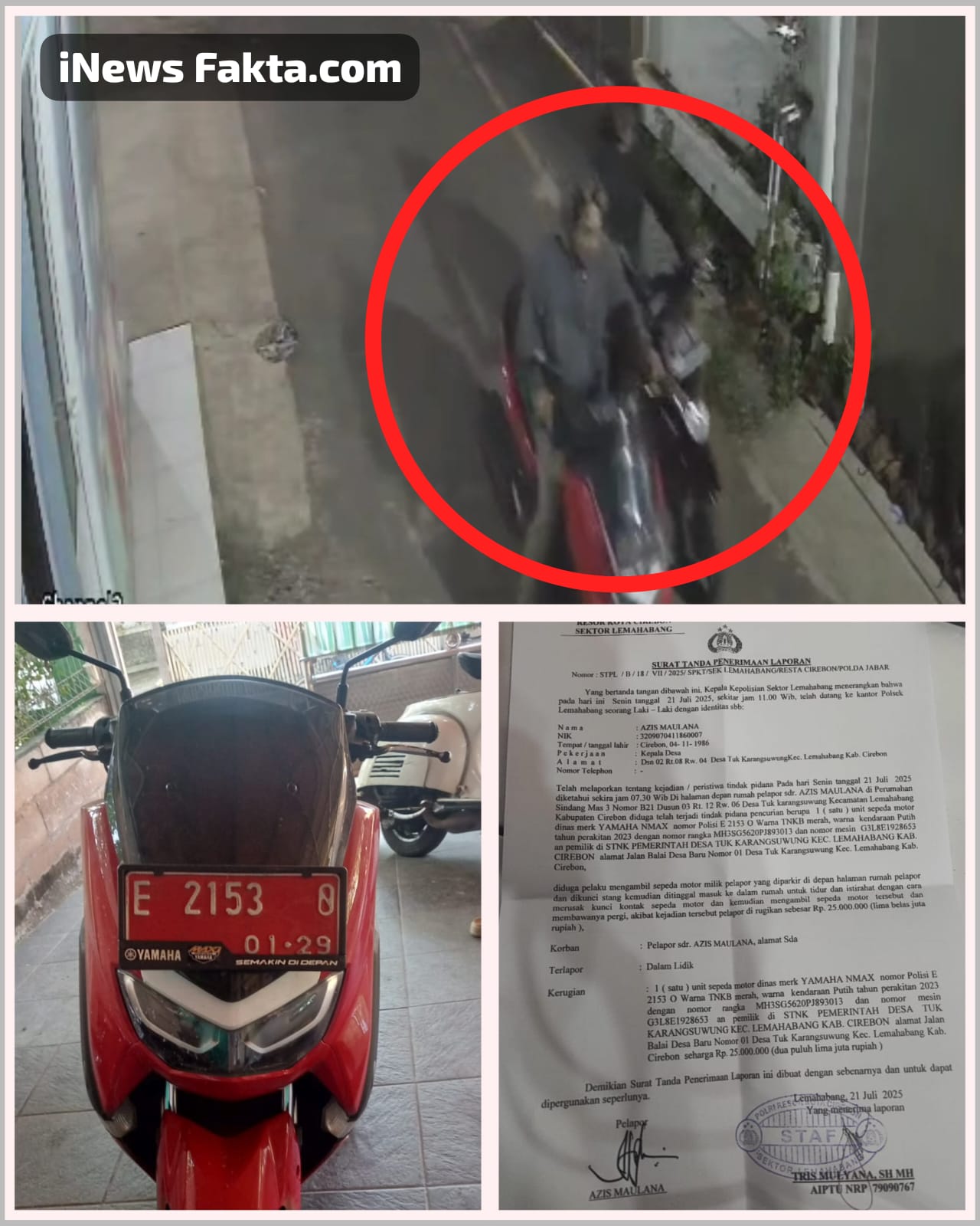 INEWSFAKTA.COM  | Kabupaten Cirebon –  Sudah satu minggu lebih, pasca kejadian pencurian sepeda motor ditempat kediaman Kepala Desa ( Kades ) atau Kuwu, Azis Maulana Desa Tuk Karangsuwung, Kecamatan Lemahabang, Kabupaten Cirebon, Provinsi Jawa Barat pada hari Senin ( 21/7/2025 ) sekitar pukul 02.28 WIB, kedua pelaku pencuri menggondol 1 (satu) Unit Sepeda Motor Dinas Yamaha NMX Nopol : E 2153 O, warna TNKB merah,Tahun perakitan 2023.(31/07/2025).