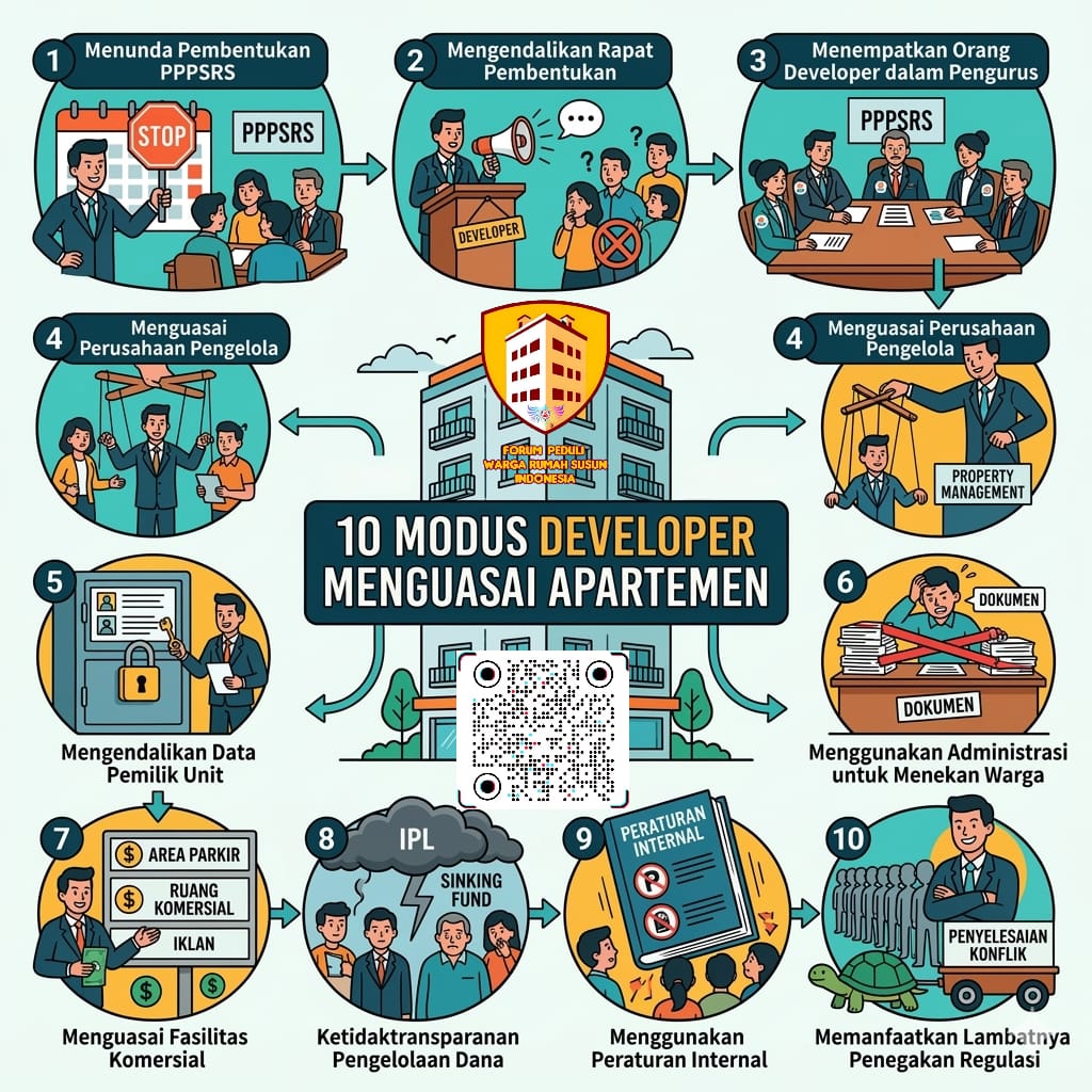 INEWSFAKTA.COM | Jakarta, 17-3-2026 – Ditengah pesatnya pembangunan apartemen di Indonesia, banyak pemilik unit rumah susun masih merasa “terkunci” dalam pengelolaan hunian mereka sendiri. Padahal, secara hukum hak pengelolaan sudah seharusnya beralih ke pemilik melalui PPPSRS setelah unit dihuni. Redaksi merangkum 10 modus yang sering digunakan developer untuk tetap menguasai apartemen, mulai dari menunda pembentukan organisasi warga hingga ketidaktransparanan pengelolaan dana. Praktik-praktik ini bukan hanya menyulitkan warga, tapi juga berpotensi menimbulkan konflik berkepanjangan dan melemahkan kualitas tata kelola apartemen.