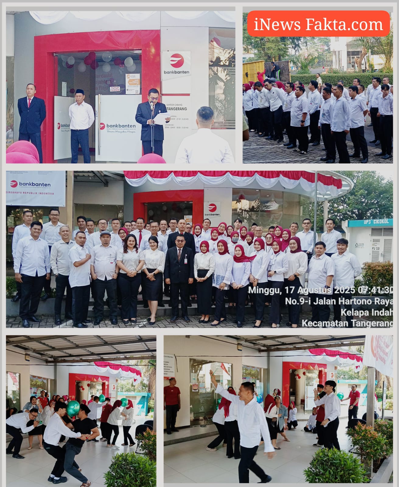INEWSFAKTA.COM | TANGERANG KOTA –  Dalam Rangka menyambut Hari Ulang Tahun Republik Indonesia (HUT RI) yang ke-80, Kantor Cabang (KC) Tangerang dan Kantor Cabang Pembantu (KCP) Ciledug, Bank Banten, menggelar upacara peringatan HUT RI di halaman Gedung KC Tangerang, Jalan Hartomo Raya, Ruko Shop House, Kota Modernland, RT 003 RW 06, Kelurahan Kelapa Indah, Kecamatan Tangerang, Kota Tangerang, Provinsi Banten, pada Minggu pagi, 17 Agustus 2025.