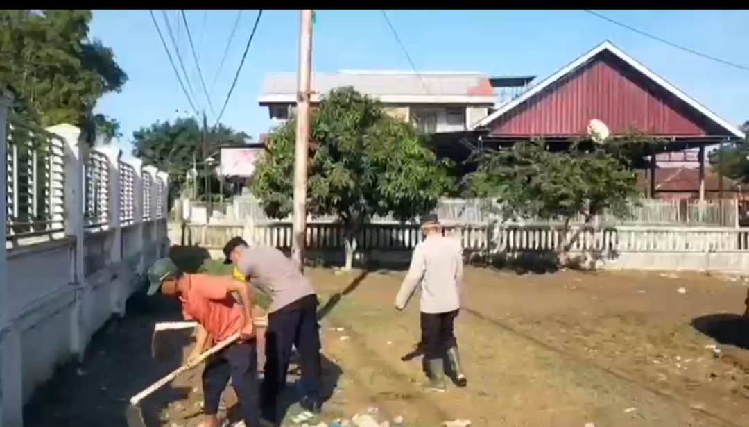 INEWSFAKTA.COM | ACEH – Personel Polres Pidie bersama warga masyarakat melaksanakan kegiatan pembersihan lumpur pasca bencana banjir di Gampong Tanjong, Kecamatan Kembang Tanjong, Kabupaten Pidie. Kegiatan tersebut dilakukan di sejumlah titik terdampak, antara lain halaman Meunasah Gampong Tanjong, lingkungan Kantor Keuchik, penanganan abrasi pada tanggul Sungai Krueng Tiro, serta pembersihan lumpur di Tempat Pemakaman Umum (TPU) Gampong Tanjong.