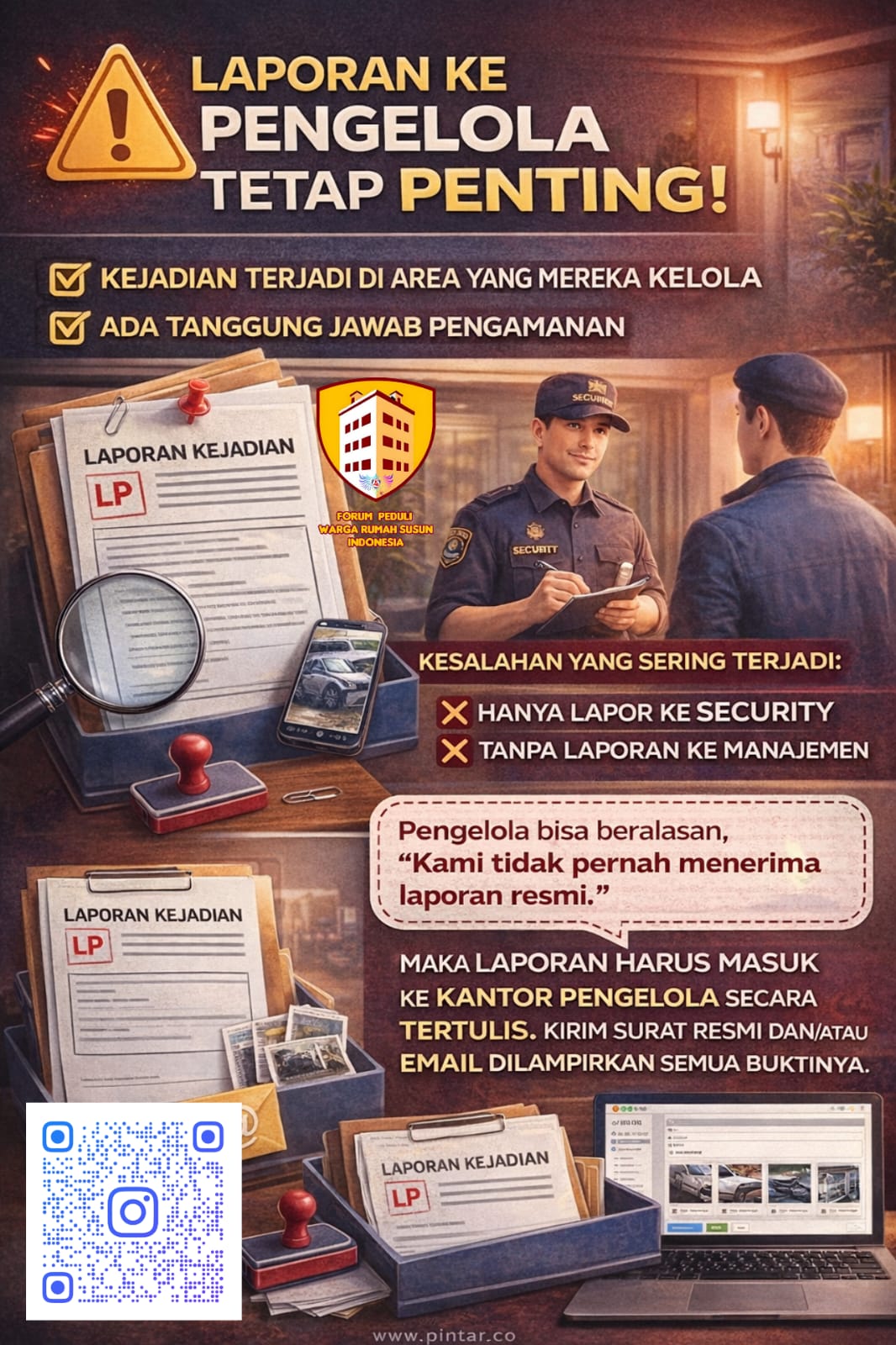 INEWSFAKTA.COM | Jakarta , 10-3-2026 – Insiden perusakan barang (contoh: kendaraan) milik warga di area parkir rumah susun atau apartemen kembali memunculkan pertanyaan mengenai prosedur pelaporan yang tepat dalam lingkungan hunian vertikal. Warga kerap dihadapkan pada dilema : apakah kejadian tersebut cukup dilaporkan kepada petugas keamanan (security) yang bertugas di lapangan, atau harus langsung disampaikan secara resmi kepada kantor pengelola apartemen sebagai pihak yang bertanggung jawab atas pengelolaan kawasan. Dalam konteks hukum dan tata kelola rumah susun, mekanisme pelaporan ini tidak sekadar persoalan administratif, tetapi juga berkaitan dengan penentuan tanggung jawab serta kekuatan pembuktian apabila kasus tersebut berlanjut ke proses hukum, baik melalui laporan kepolisian maupun penyelesaian di pengadilan.