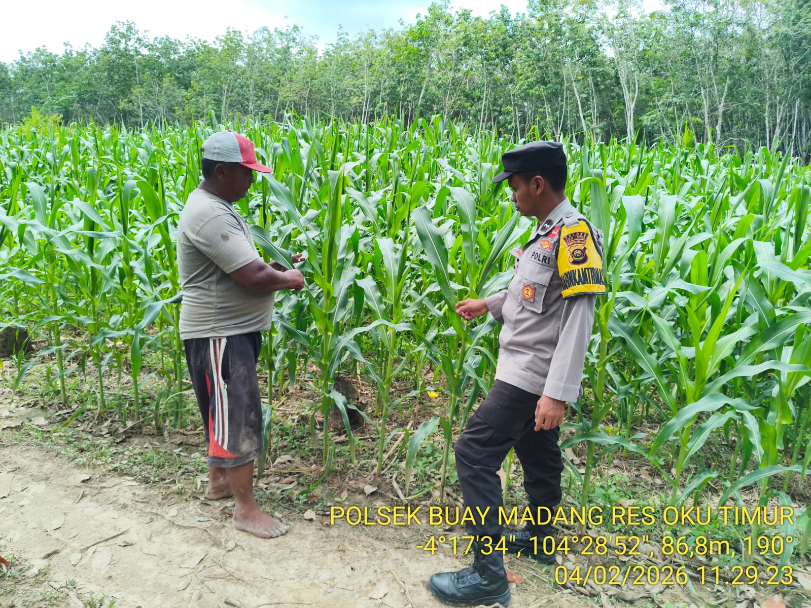 INEWSFAKTA.COM | Oku Timur – Bhabinkamtibmas Polsek Buay Madang, Polres Oku Timur, Polda Sumsel, melaksanakan pengecekan tanaman Jagung Manis dilahan pekarangan milik warga binaan Desa Kurungan Nyawa III Kecamatan Buay Madang Kab. OKU Timur, Kamis (05/02/2026).
