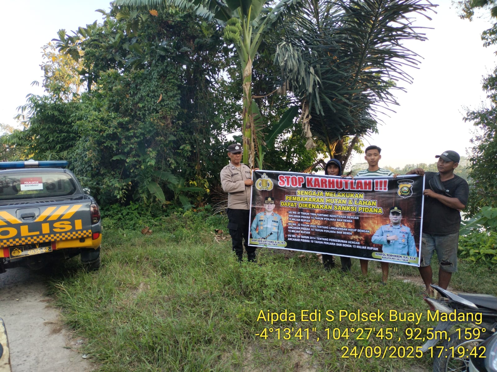 INEWSFAKTA.COM | Oku Timur – Polsek Buay Madang, Polres Oku Timur, Polda Sumsel, gencarkan sosialisasi dengan memasang Spanduk dan himbau warga untuk tidak membakar hutan Dan lahan (Karhutla) di Desa Anyar Kecamatan BP Bangsa Raja. Mengingat rawan terjadi Karhutlah saat ini, Kapolsek Buay Madang perintahkan anggota untuk mensosialisasikan ke warga masyarakat setempat agar tidak melakukan pembakaran hutan dan lahan dikarenakan ada ancaman pidana dan denda bagi yang melakukan pembakaran, Sabtu (25/09/2025).