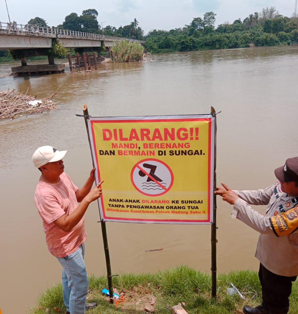 Cegah Korban Tenggelam! Polsek Madang Suku II, Pasang Spanduk Himbauan Di Pemukiman Warga Dan Di Pinggir Sungai