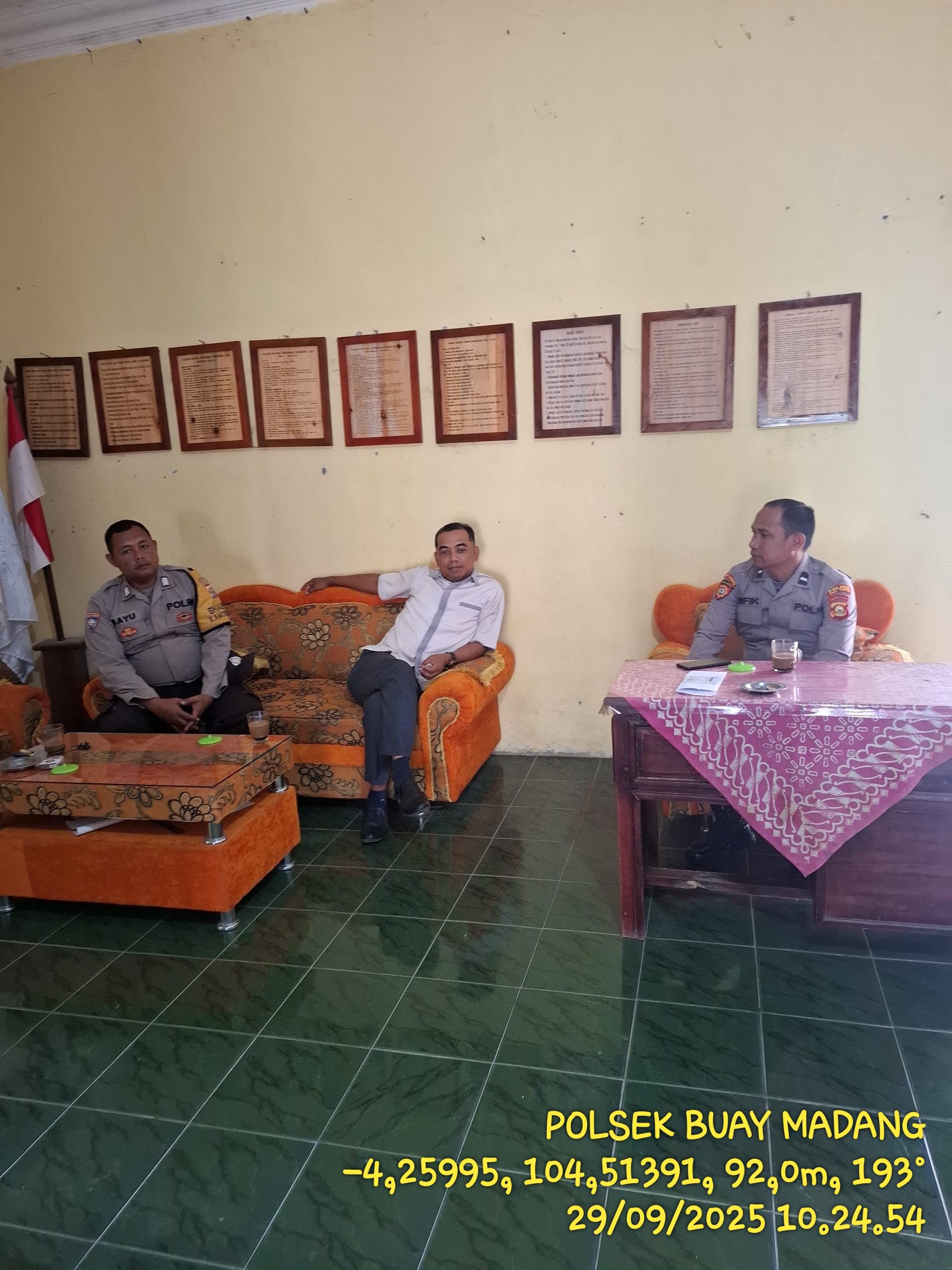 INEWSFAKTA.COM | OKU Timur  – Personil Polsek Buay Madang, Polres Oku Timur, Polda Sumsel, Sambangi Kantor Desa Mulyo Agung Kec. Buay Madang Kab.Oku Timur, guna menjalin sinergitas dan menyampaikan himbauan Kamtibmas. Sambang tersebut diisi dengan melakukan dialog dan Koordinasi bersama Kepala Desa berserta perangkat nya serta menggali informasi yang selama ini belum pernah disampaikan ke Polsek agar cepat ditindak lanjuti, Selasa (30/11/2024).