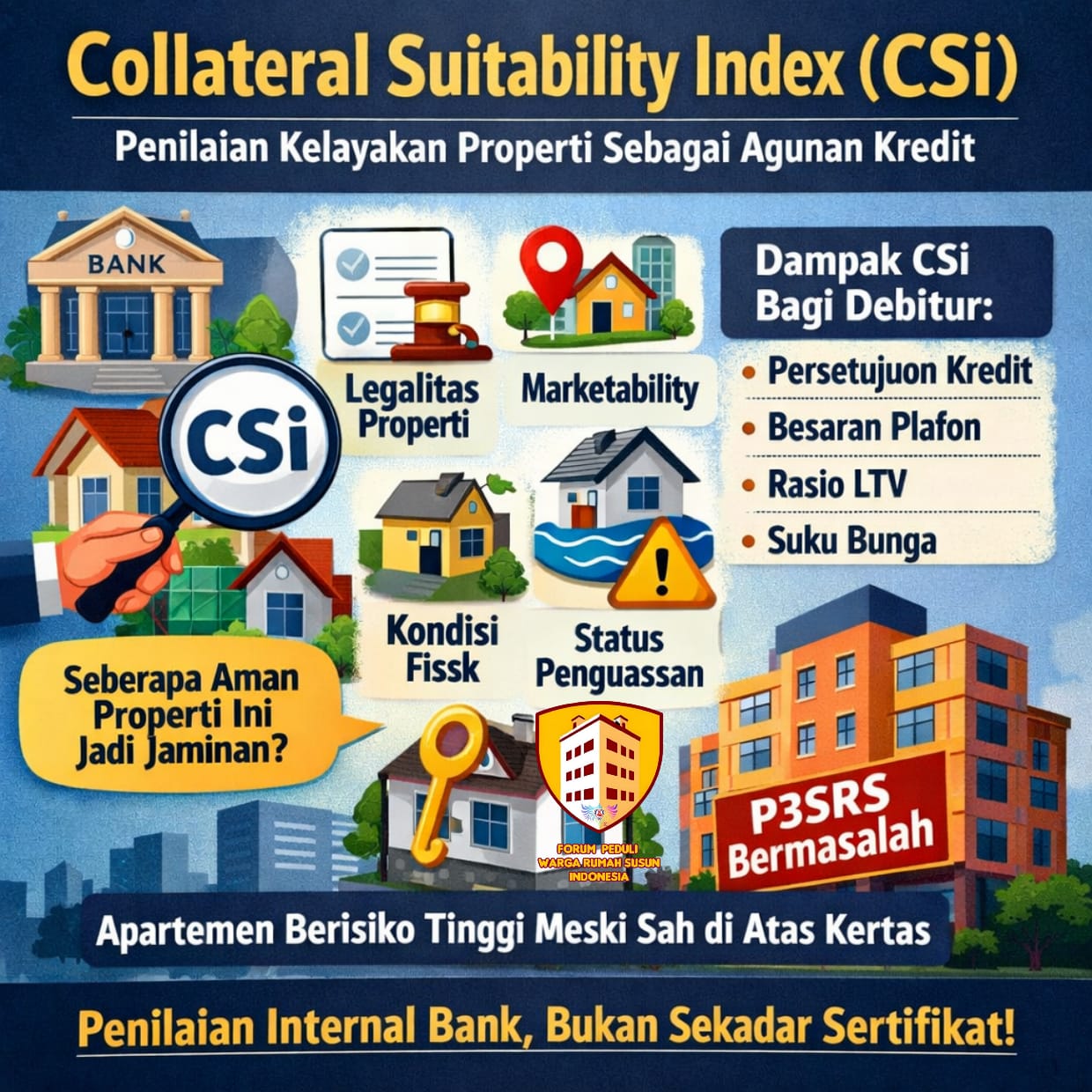 INEWSFAKTA.COM | Jakarta , 17-1-2026 – Dalam praktik perkreditan perbankan, kelayakan suatu properti sebagai agunan tidak semata-mata ditentukan oleh ada atau tidaknya sertifikat, melainkan melalui penilaian internal bank yang dikenal sebagai Collateral Suitability Index (CSi). CSi merupakan instrumen manajemen risiko yang digunakan bank untuk menakar seberapa aman sebuah properti dijadikan jaminan apabila debitur gagal bayar. Meski bukan istilah hukum dan tidak tercantum secara eksplisit dalam peraturan perundang-undangan, CSi memiliki dampak nyata bagi debitur—mulai dari disetujui atau tidaknya kredit, besaran plafon, rasio Loan to Value (LTV), hingga suku bunga. Melalui CSi, bank menilai aspek legalitas, kemudahan dijual, kondisi fisik, status penguasaan, hingga risiko spesifik properti, yang dalam konteks rumah susun atau apartemen kerap menempatkan unit-unit tertentu pada kategori berisiko tinggi, meskipun secara formal tampak sah di atas kertas.