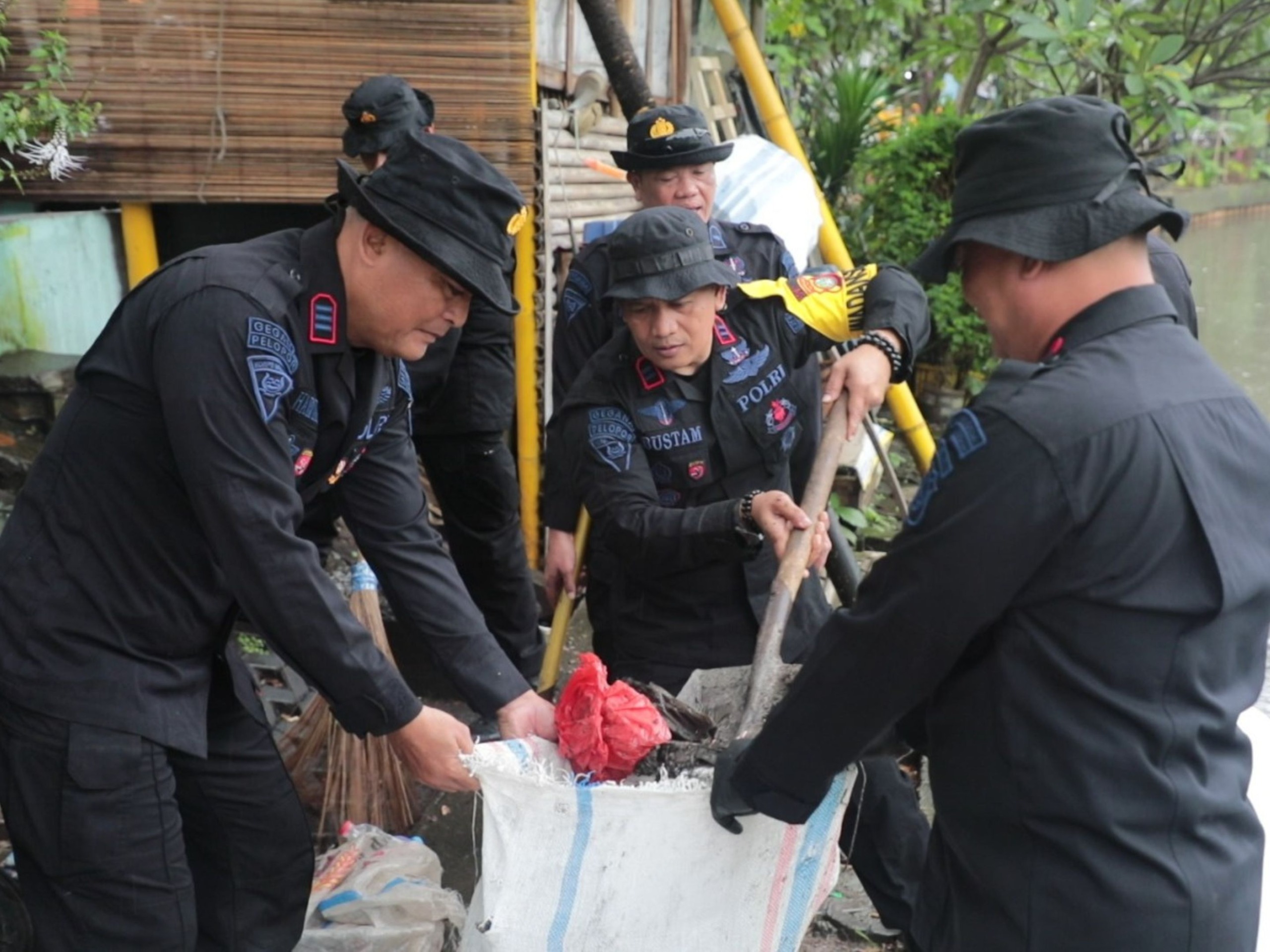 Sebanyak 1 pleton Brimob bersama unsur terkait lainnya diterjunkan untuk membersihkan sampah dan puing di sepanjang Kali Grogol. Pelaksanaan kerja bakti ini mengedepankan kolaborasi lintas sektor sehingga hasilnya maksimal.