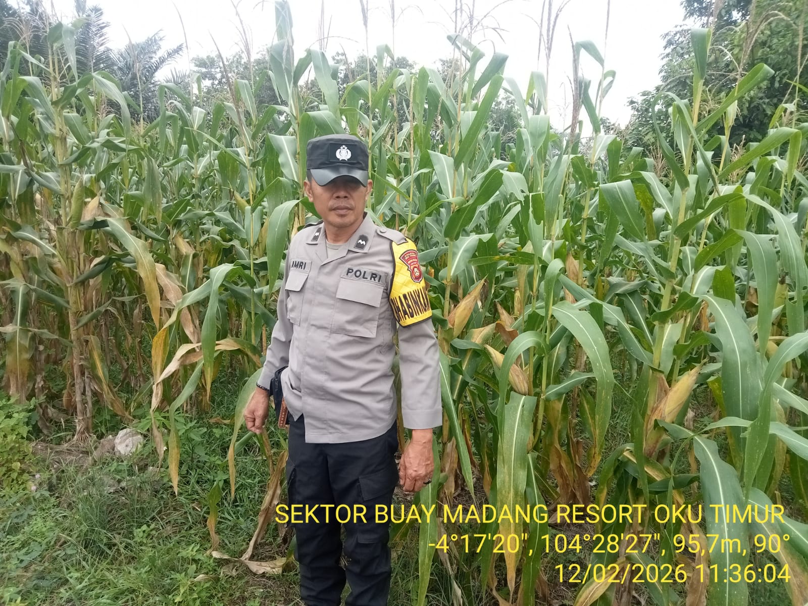 INEWSFAKTA.COM | Oku Timur – Personil Polsek Buay Madang, Polres Oku Timur, Polda Sumsel, melaksanakan pengecekan tanaman Jagung Manis dilahan pekarangan milik warga binaan Desa Aman Jaya, Kecamatan Buay Madang Kab. OKU Timur, Selasa (03/03/2026).