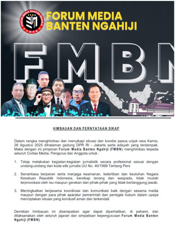 Forum Media Banten Ngahiji juga mengajak seluruh elemen masyarakat, termasuk media, untuk tetap berperan sebagai penyejuk dan pengawal informasi yang objektif. Media harus hadir memberikan pencerahan, bukan memperkeruh suasana.
