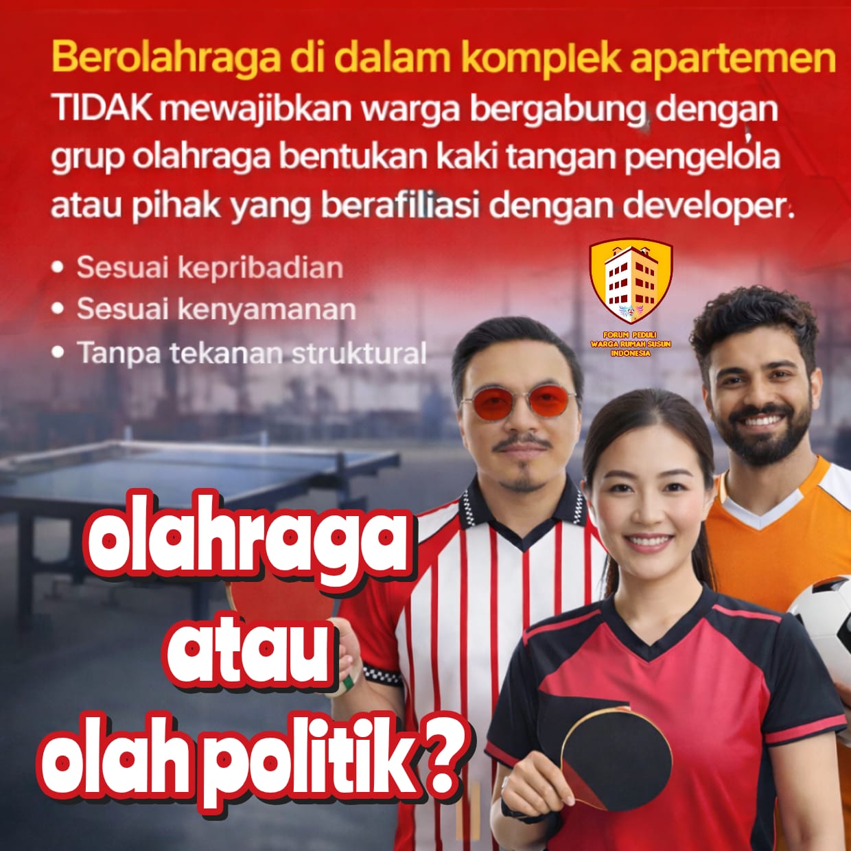 INEWSFAKTA.COM | Jakarta, 5-1-2026 — Seorang tokoh warga apartemen kembali menerima aduan dari penghuni terkait penggunaan fasilitas olahraga bersama. Kali ini, laporan datang dari tiga warga yang tergabung dalam kelompok persatuan tenis meja. Salah satu aduan disampaikan pada sore hari kemaren, menandai munculnya persoalan baru (sejak) di penghujung 2025—melanjutkan rangkaian konflik yang sempat memuncak pada akhir 2022.