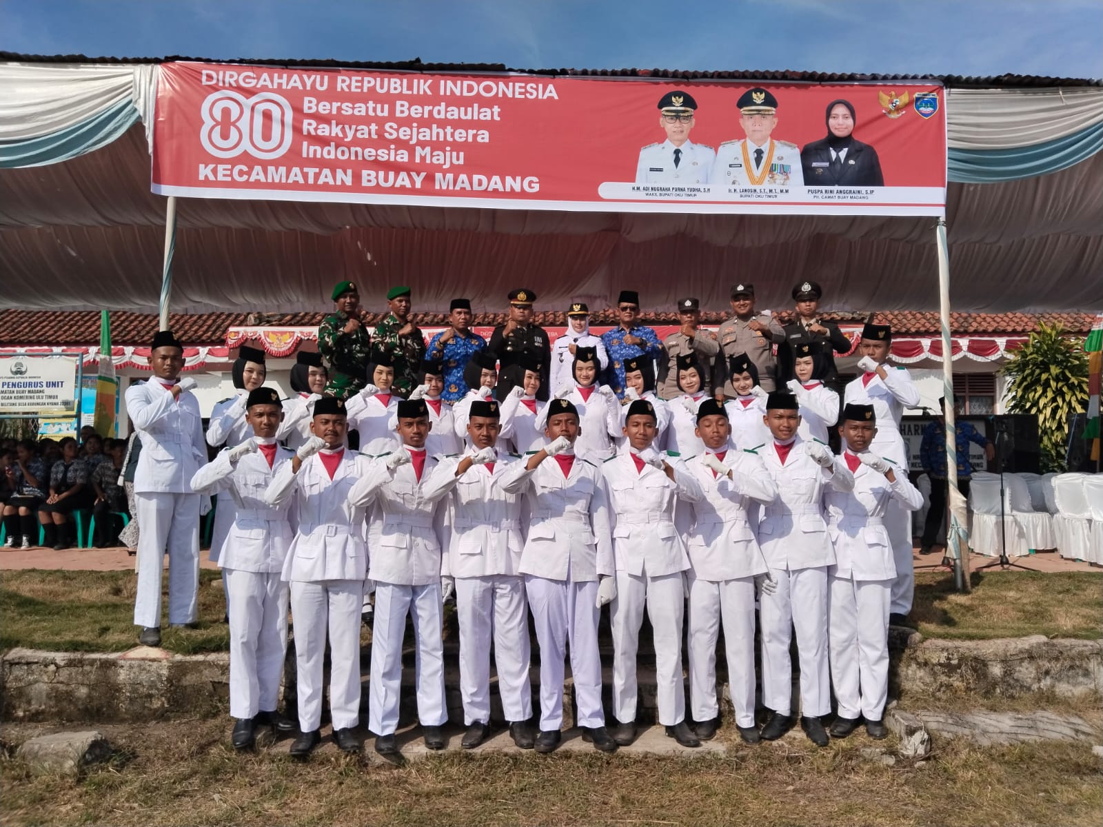 INEWSFAKTA.COM | Oku Timur –Kapolsek Buay Madang Polres Oku Timur Polda Sumsel, AKP, Sofian Ardeni, SH, hadiri kegiatan Upacara peringatan HUT Ke- 80 Kemerdekaan RI, yang bertempat di Lapangan depan Kantor Kecamatan Buay Madang Kab. OKU Timur. Kegiatan Upacara HUT RI Ke-80 turut dihadiri unsur Muspika, Camat Buay Madang, Danramil 403-05/ Buay Madang, Kepala KUA Kec. Buay Madang, Ketua Penggerak PKK Kec. BMD, Bhayangkari Ranting BMD, Kepala UPTD dan Korwil wilayah Kec. BMD, Kepala Desa se Buay Madang dan Kepala Sekolah se Kecamatan BMD, Minggu (17/08/2025).