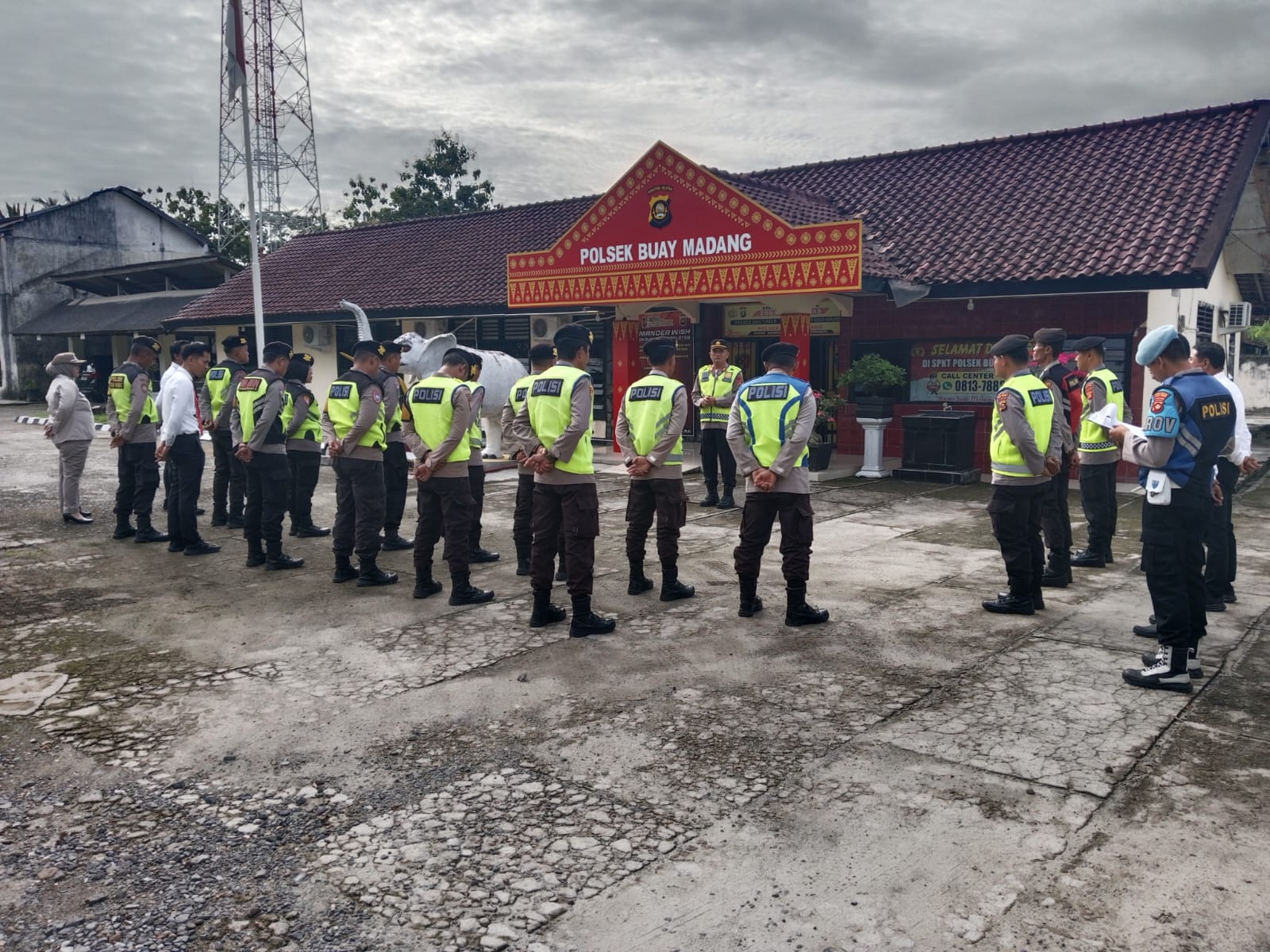 INEWSFAJTA.COM | Oku Timur –  Polsek Buay Madang, Polres Oku Timur, Polda Sumsel, Pasca Cuti bersama pada lebaran idul Fitri 1446 Hijriyah, Kapolsek Buay Madang, AKP, Azwan,SH.,MH pimpin apel perdana yang di laksanakan di halaman Mako Polsek Buay Madang, Senin (07/04/24).