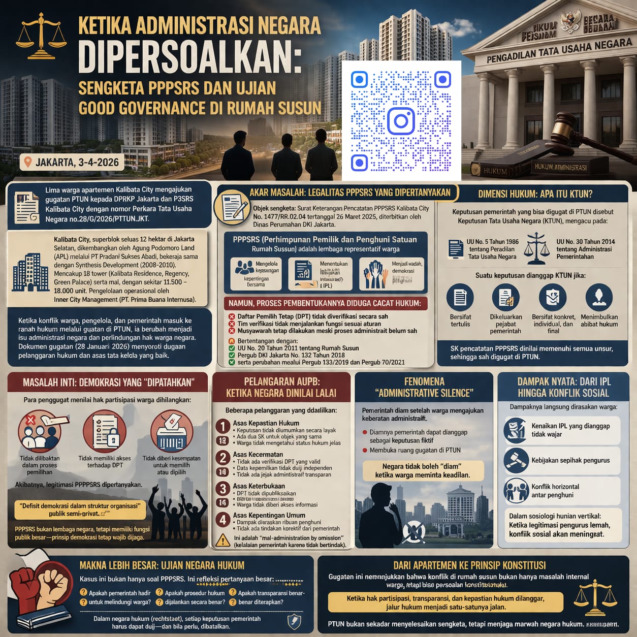 Dalam praktik tata kelola rumah susun di Indonesia, konflik antara warga, pengelola, dan pemerintah bukanlah hal baru. Namun, ketika konflik tersebut masuk ke ranah hukum melalui gugatan di Pengadilan Tata Usaha Negara (PTUN), persoalan tersebut naik kelas: dari sekadar konflik internal menjadi isu administrasi negara dan perlindungan hak warga negara.