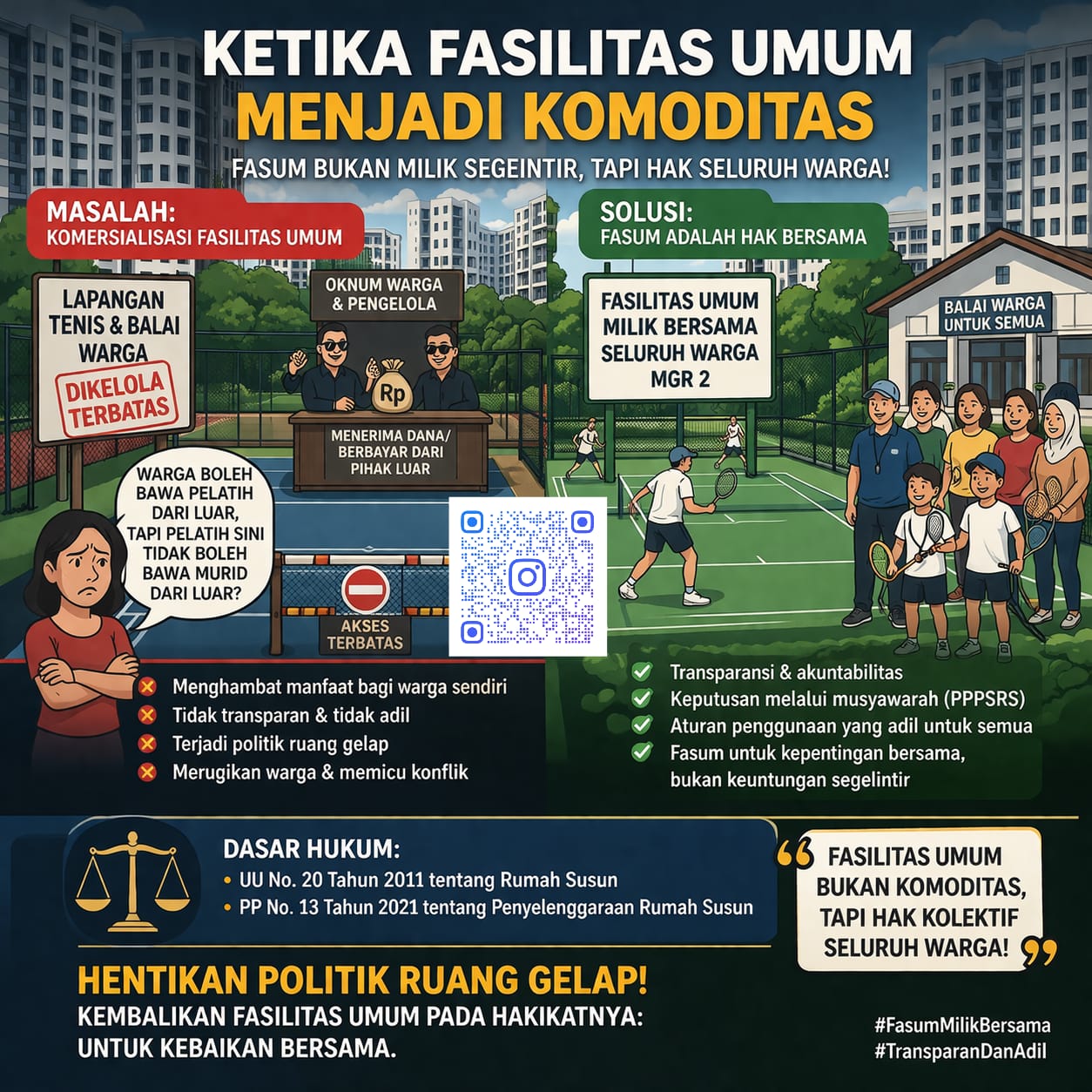 INEWSFAKTA.COM | Jakarta, 3-4-2026 – Di banyak apartemen dan rumah susun di Indonesia, fasilitas umum (fasum) seperti lapangan tenis, balai warga, atau ruang serbaguna pada awalnya dirancang sebagai ruang bersama—tempat interaksi sosial, olahraga, dan penguatan komunitas penghuni. Namun dalam praktiknya, muncul fenomena yang patut dikritisi: pengkomersialan fasilitas umum oleh oknum warga maupun pengelola, yang justru membatasi akses bagi penghuni itu sendiri.
