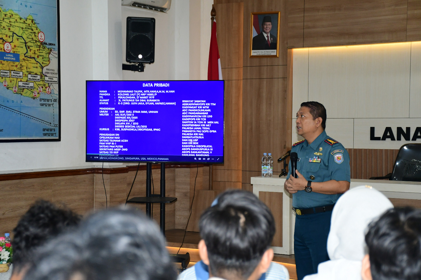Dalam sambutannya, Danlanal Bandung menyampaikan ucapan terima kasih dan selamat datang di Mako Lanal Bandung, dimana Pangkalan TNI AL Bandung berposisi di Kota Bandung yang mempunyai wilayah Laut yang luas dan pengendaliannya ada di Bandung. Agar secara umum lebih mengenal dan berdiskusi serta mencoba untuk memberikan penyampaian, keterangan tentang Peran TNI AL dalam Pengamanan Jalur Perdagangan Laut (Sudut Pandang Penegak Hukum) Kontribusi Terhadap Stabilitas Ekonomi Nasional sehingga apa yang menjadi pertanyaan ini bisa terjawab karena kami yakin adik-adik sekalian mempunyai ilmu yang mulai dari Semester 1 sampai semester 7 tentunya memiliki variasi pengetahuan yang berbeda-beda dengan basic ataupun latar belakang yang juga berbeda.