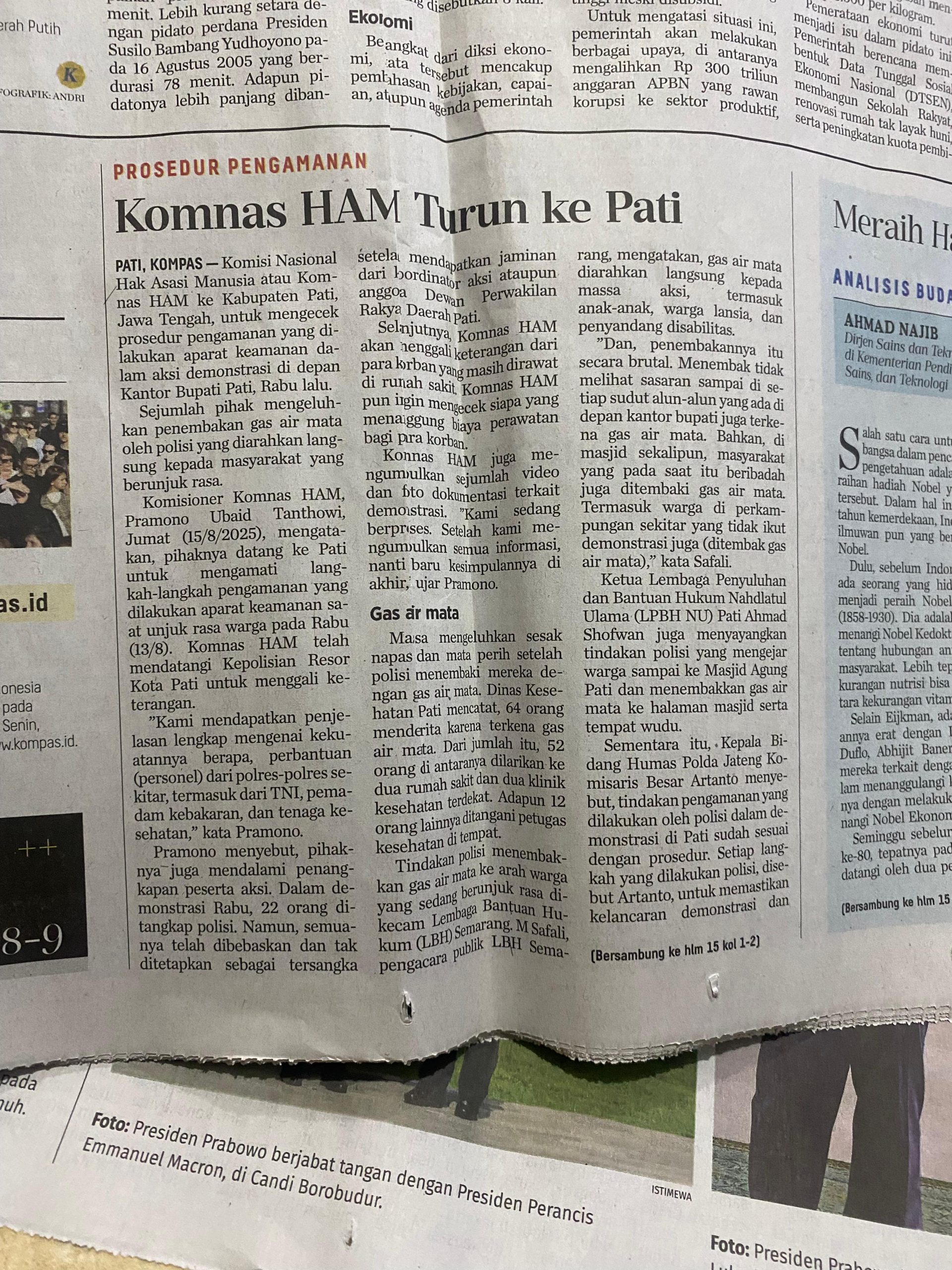 INEWSFAKTA.COM | Pati, 16 Agustus 2025 – Komisi Nasional Hak Asasi Manusia (Komnas HAM) melakukan pemantauan langsung di Kabupaten Pati, Jawa Tengah, usai terjadinya aksi unjuk rasa yang berakhir ricuh pada Jumat (15/8). Dalam aksi tersebut, aparat kepolisian menembakkan gas air mata ke arah massa, yang diduga juga berdampak pada warga sekitar yang tidak terlibat demonstrasi.