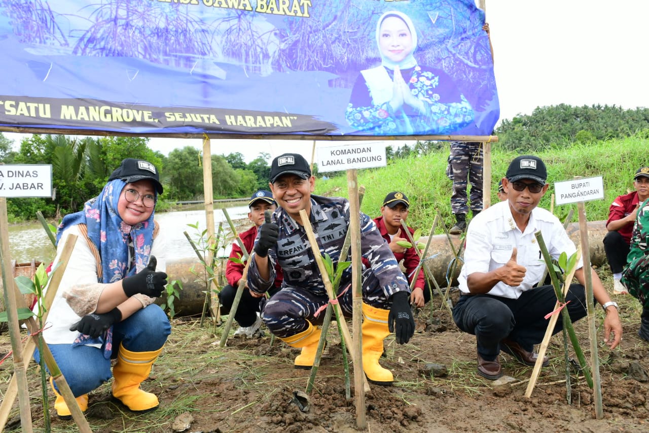 Komandan Lanal Bandung Kolonel Laut (P) Erfan Indra Darmawan, S.E., M.Tr.Hanla., M.M., CIQaR., dan Kadis DKP Provinsi Jawa Barat beserta rombongan menanam Mangrove secara simbolis sebagai tanda dimulainya penanaman Mangrove.