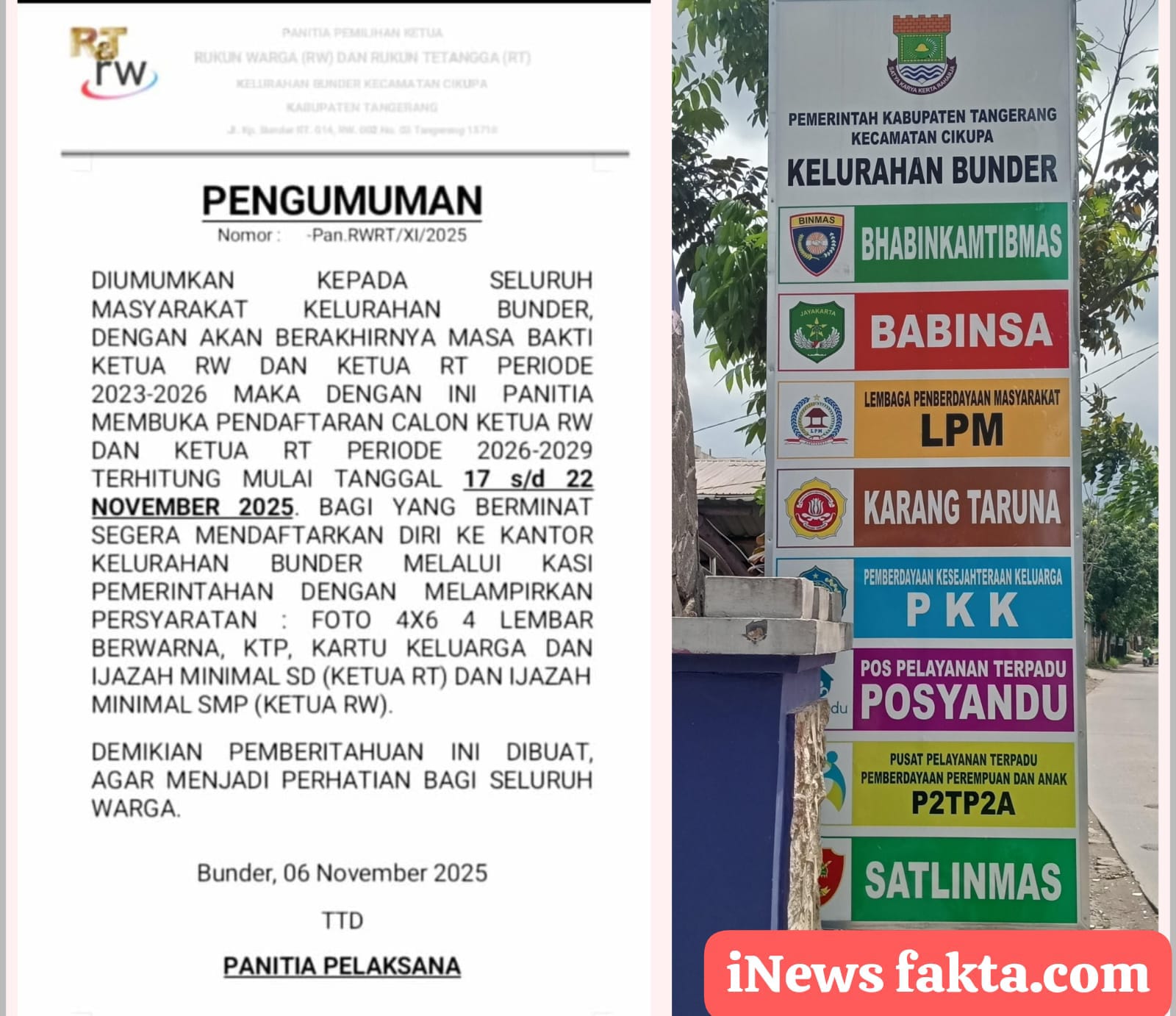 INEWSFAKTA.COM | CIKUPA – Lurah Hj.Ine Susilawati, A.Md.,Kep.SKM., Pemerintah Kelurahan Bunder Kecamatan Cikupa, Kabupaten Tangerang, Provinsi Banten, melalui Panitia penyelenggara Pemungutan Suara oleh Yakub selaku Ketua Lembaga Pemerdaya Masyarakat (LPM). Resmi membuka pendaftaran calon Ketua Rukun Tetangga (RT) calon Ketua Rukun Warga (RW) se-Kelurahan Bunder dimulai pada tanggal 17 – 22 November 2025 Periode 2026 – 2029. Adapun Calon Ketua RT mencakup keseluruhan total 14 RT dan 03 RW. RT 01 hingga RT 014 dan Ketua RW 01, 02 dan RW 03 di Kelurahan Bunder.