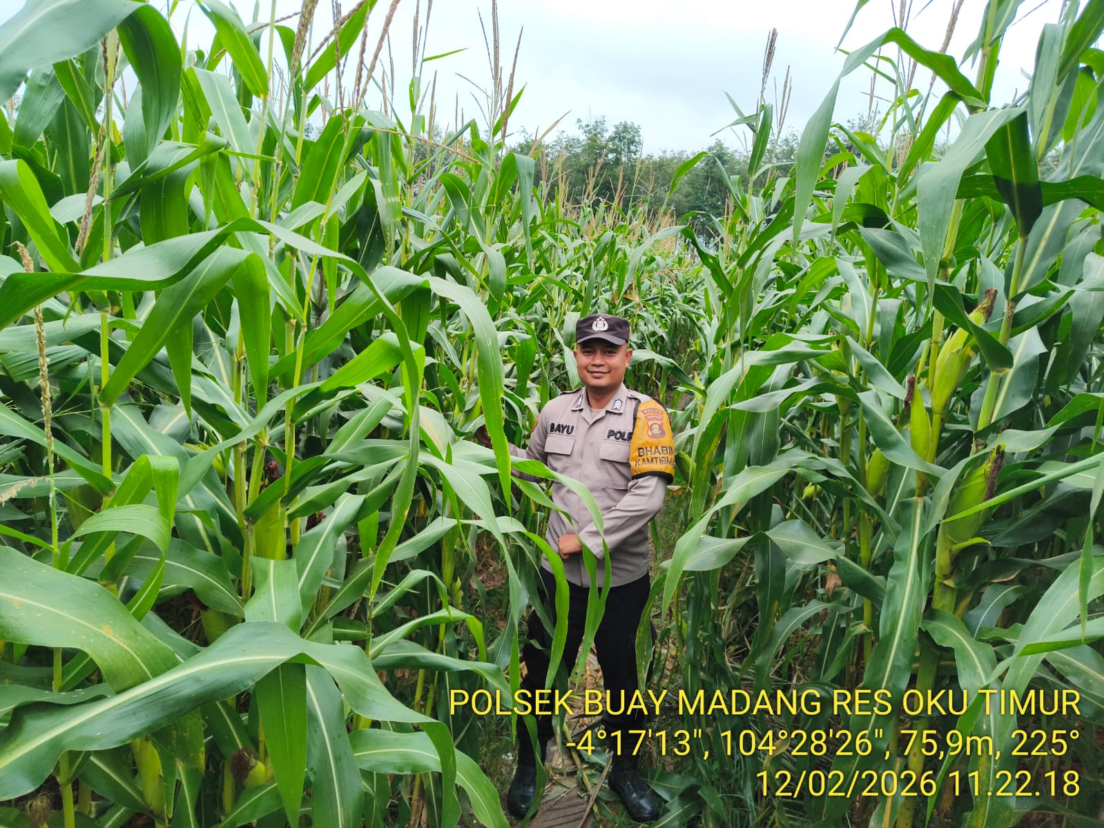 INEWSFAKTA.COM | Oku Timur – Bhabinkamtibmas Polsek Buay Madang, Polres Oku Timur, Polda Sumsel, melaksanakan pengecekan tanaman Jagung Manis dilahan pekarangan milik warga binaan Desa Aman Jaya, kecamatan Buay Madang Kab. OKU Timur, Senin (23/03/2026).