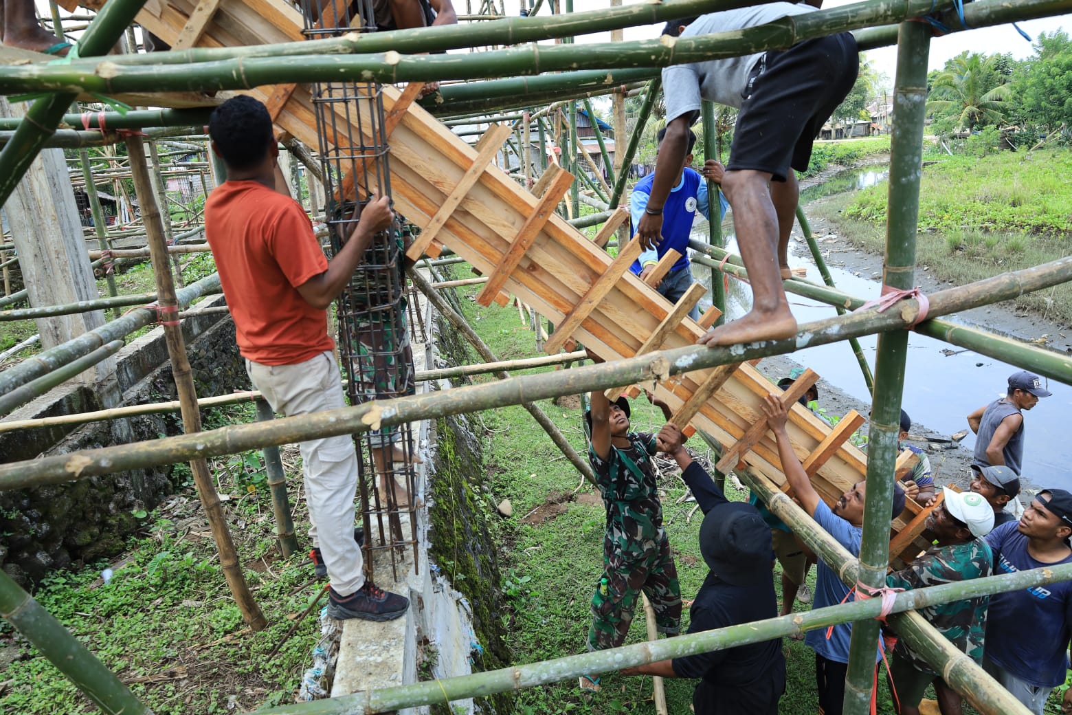 Kegiatan gotong royong tersebut dilakukan dengan penuh semangat. Anggota Satgas bersama masyarakat tampak kompak mengangkat papan mal yang sudah disiapkan, kemudian memasangnya di setiap tiang yang akan dicor. Pekerjaan ini merupakan salah satu tahapan penting dalam pembangunan masjid yang menjadi sasaran fisik program TMMD di Desa Lifofa.