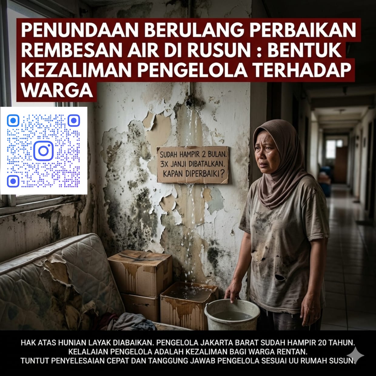 Hal ini merupakan bentuk kezaliman pengelola rusun terhadap warga, karena mengabaikan kewajiban hukum dan etis untuk menjaga kelaikan hunian. Warga terpaksa menanggung kerusakan interior unit yang semakin parah, kerugian materiil, serta penurunan kualitas hidup akibat kelembaban, jamur, dan ketidaknyamanan yang berkepanjangan, sementara pengelola berulang kali memberikan harapan palsu tanpa tindakan nyata. Kondisi ini mencerminkan pelanggaran terhadap hak atas hunian layak sebagaimana diatur dalam Undang-Undang Rumah Susun dan prinsip keadilan sosial.