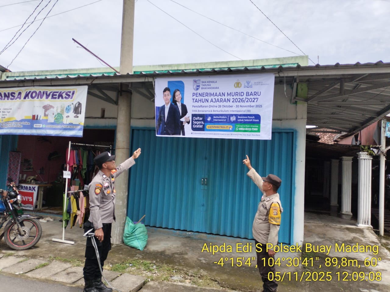 INEWSFAKTA.COM | OKU Timur– Bhabinkamtibmas Polsek Buay Madang, Polres Oku Timur, Polda Sumsel, melaksanakan kegiatan sosialisasi penerimaan peserta didik baru (PPDB) SMA Kemala Taruna Bhayangkara 2026/2027 , dengan pemasangan banner atau spanduk di Desa Kurungan Nyawa, Kecamatan Buay Madang, Kab. Oku Timur, Jum’at (05/12/2025)