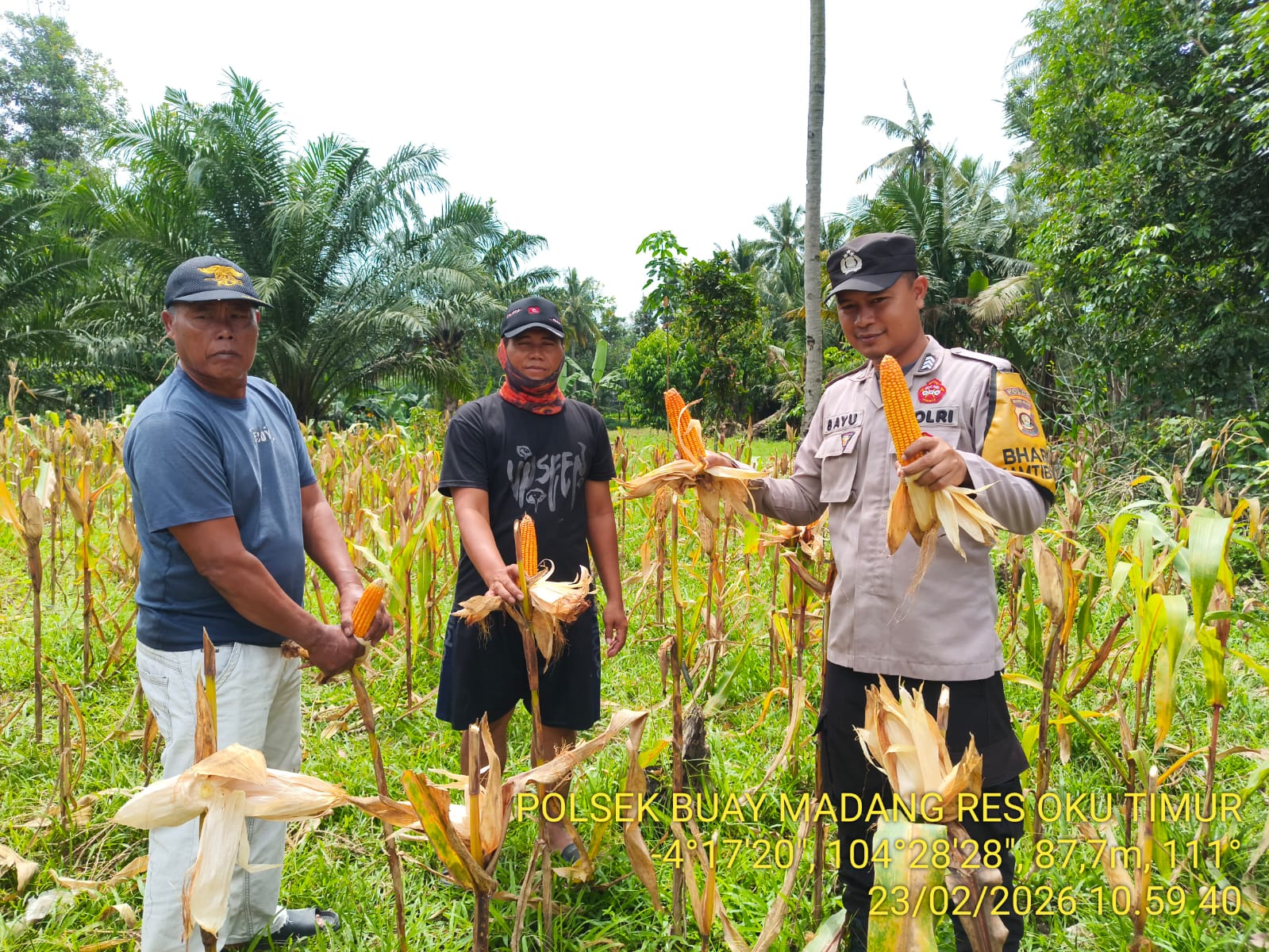 INEWSFAKTA.COM | Oku Timur – Bhabinkamtibmas Polsek Buay Madang, Polres Oku Timur, Polda Sumsel, melaksanakan panen Jagung ketahanan pangan bergizi di pekarangan milik warga Desa Binaan dengan luas lahan 1.000 M² di Desa Tebat Jaya Kecamatan, Buay Madang, Kab. Oku Timur, Jum’at (06/03/2026).