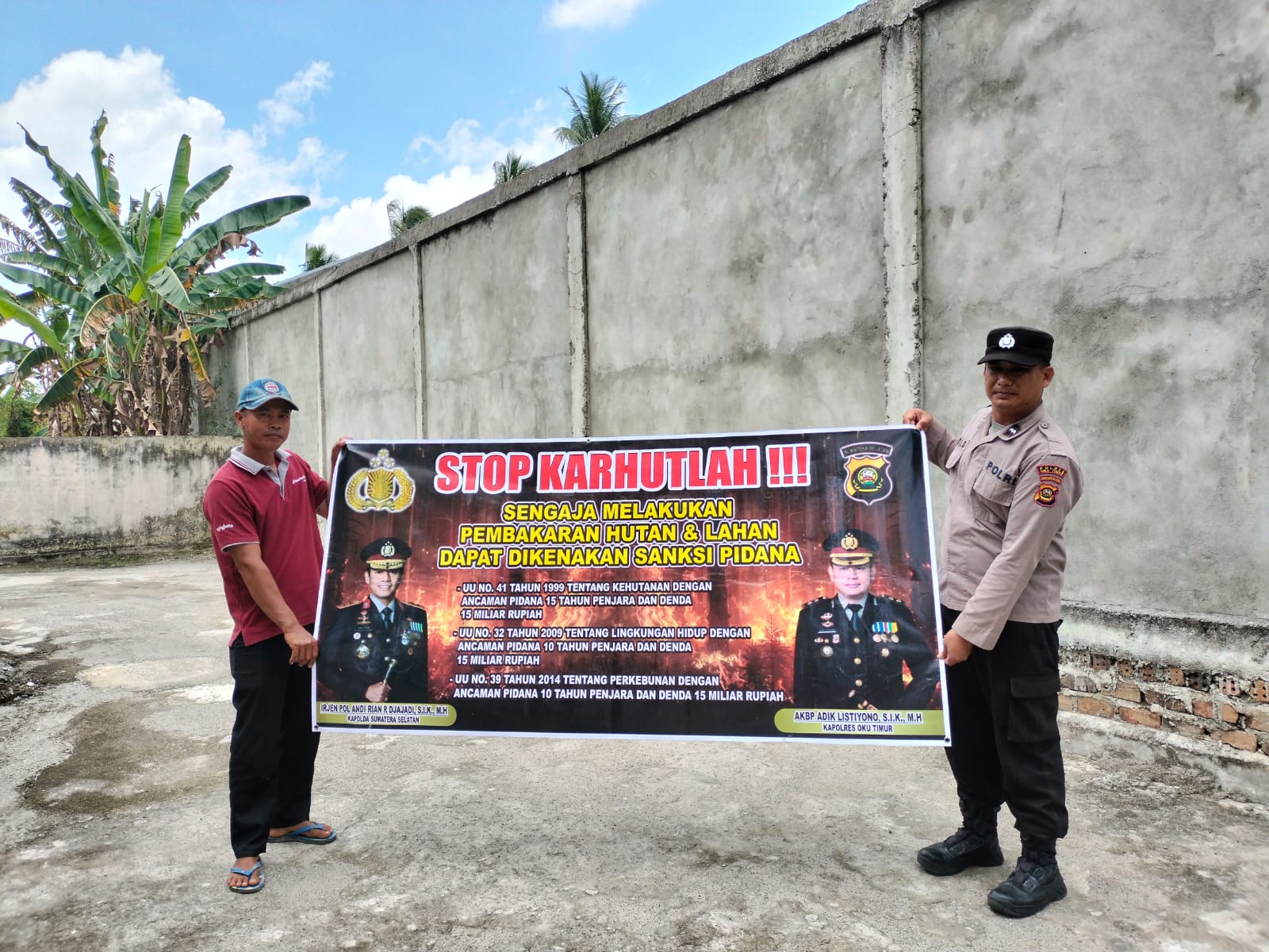 INEWSFAKTA.COM | Oku Timur – Polsek Buay Madang, Polres Oku Timur, Polda Sumsel, gencarkan sosialisasi dengan memasang Spanduk dan himbau warga untuk tidak membakar hutan Dan lahan (Karhutla) di Desa Kurungan Nyawa, Kecamatan Buay Madang, Kab. Oku Timur. Mengingat rawan terjadi Karhutlah saat ini, Kapolsek Buay Madang perintahkan anggota untuk mensosialisasikan ke warga masyarakat setempat agar tidak melakukan pembakaran hutan dan lahan dikarenakan ada ancaman pidana dan denda bagi yang melakukan pembakaran, Minggu (21/12/2025).