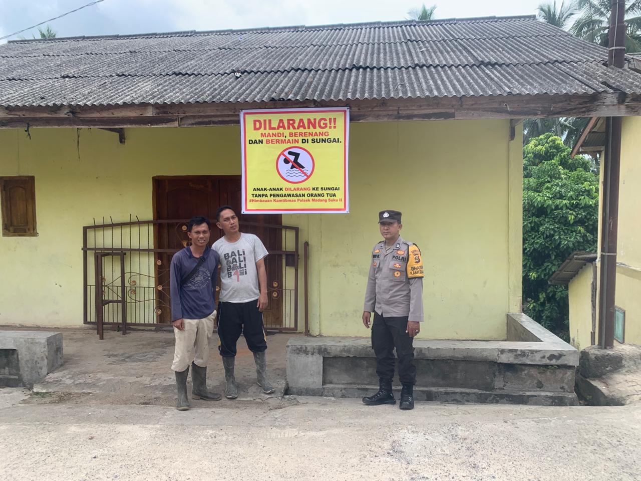 Personil Polsek Madang Suku II, Pasang Spanduk Himbauan Larangan Mandi Di Sungai Di Desa Surabaya