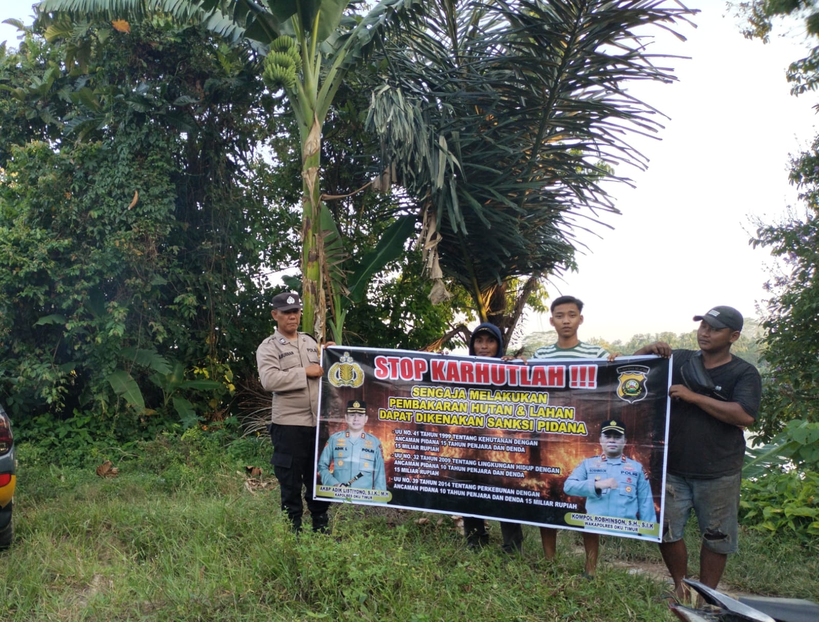 INEWSFAKTA.COM | Oku Timur – Polsek Buay Madang, Polres Oku Timur, Polda Sumsel, gencarkan sosialisasi dengan memasang Spanduk dan himbau warga untuk tidak membakar hutan Dan lahan (Karhutla) di Desa Aman Jaya , Kecamatan Buay Madang, Kab. Oku Timur. Mengingat rawan terjadi Karhutlah saat ini, Kapolsek Buay Madang perintahkan anggota untuk mensosialisasikan ke warga masyarakat setempat agar tidak melakukan pembakaran hutan dan lahan dikarenakan ada ancaman pidana dan denda bagi yang melakukan pembakaran, Rabu (15/10/2025).