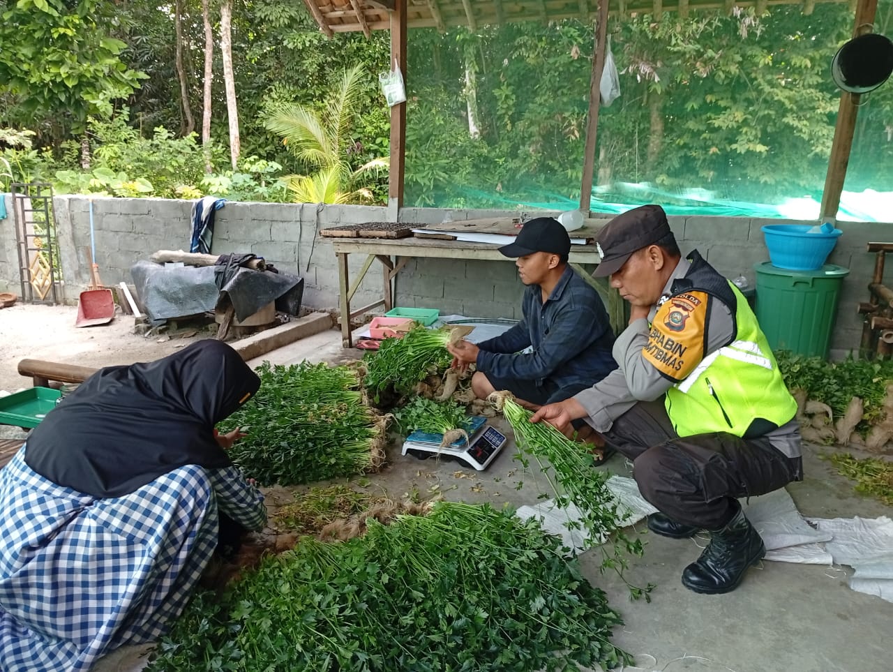 INEWSFAKTA.COM | Oku Timur – Bhabinkamtibmas Polsek Buay Madang, Polres Oku Timur, Polda Sumsel, Aiptu ,M. Burnan mengunjungi saudara Khalid Ismail yang sedang memanen Seledri di pekarangan rumah yang dimanfaatkan sebagai lahan produktif dikelola untuk menanam berbagai jenis sayuran secara hidroponik di Desa Kurungan Nyawa I, Kecamatan Buay Madang, Kab. Oku Timur. Kegiatan tersebut dalam rangka mendukung program pemerintah terkait pekarangan pangan bergizi untuk ketahanan pangan lokal, Minggu (21/12/2025).