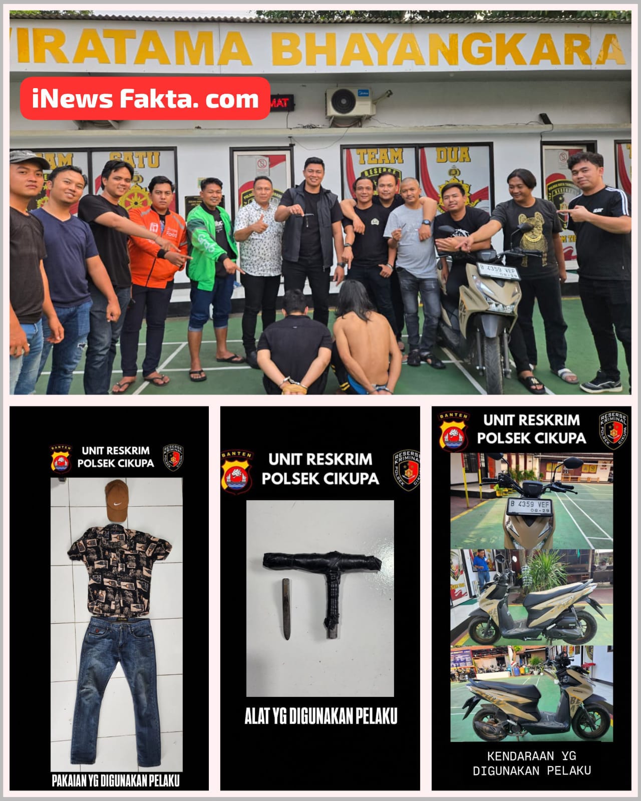 “Pada Senin (22/9) sekitar pukul 14.00 WIB, tim berhasil menangkap kedua tersangka di sebuah kontrakan di Kampung Bulakan, Desa Bitung Jaya, Kecamatan Cikupa. Dari tangan mereka diamankan barang bukti satu unit sepeda motor dengan nomor polisi palsu, kunci leter T, serta sejumlah pakaian dan rekaman CCTV,” jelas Ipda Syaiful.