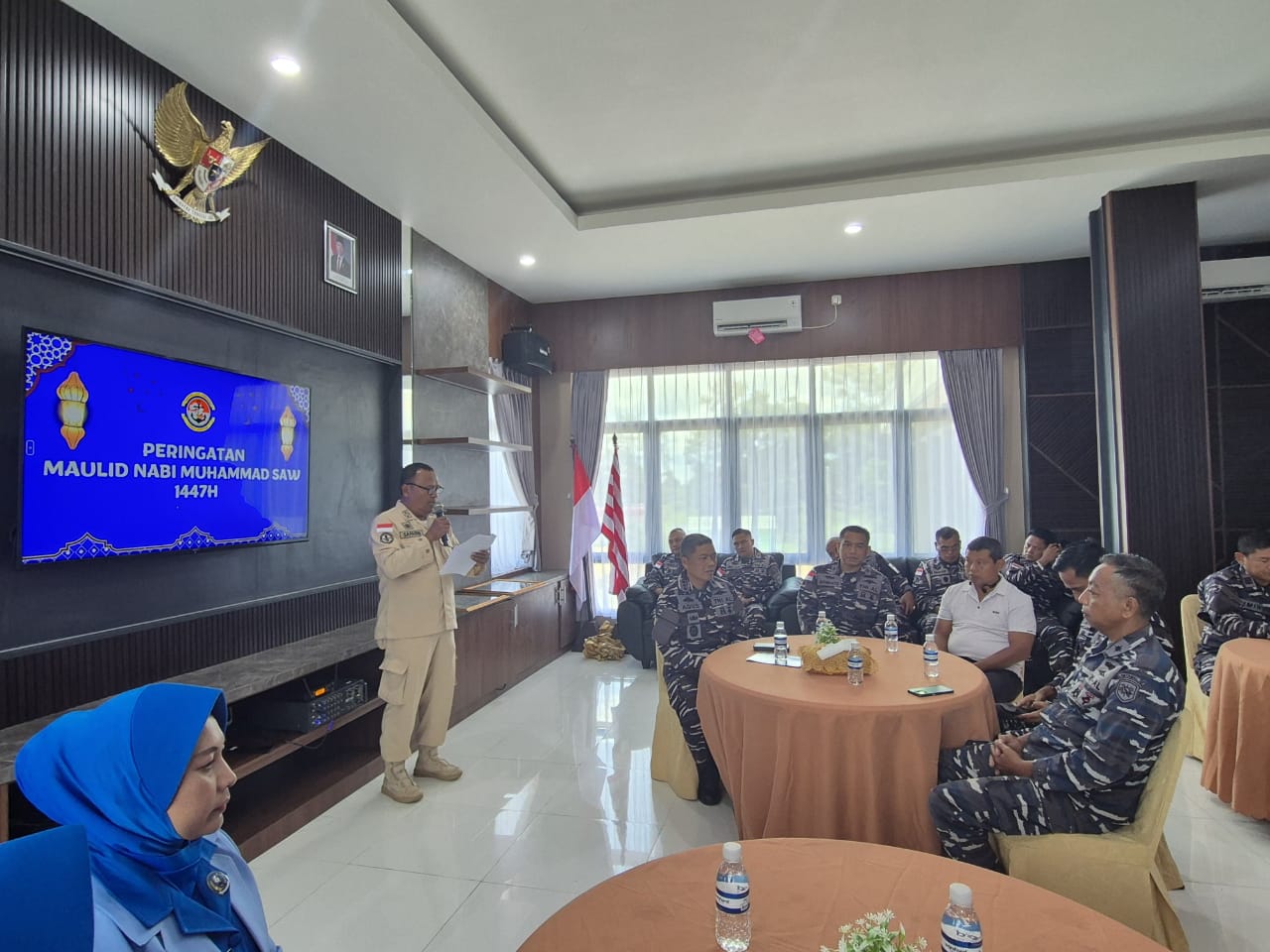 INEWSFAKTA.COM | TNI AL, Bintan,- Komandan Lanal Bintan Kolonel Laut (P) Dr. Eko Agus Susanto, S.E., M.M., beserta Prajurit Lanal Bintan dan Pengurus Cabang 5 Daerah Kodaeral IV dan Gabungan Jalasenastri Armada RI mengikuti Peringatan Maulid Nabi Muhammad SAW 1447 H/2025 M, bertempat di Mako Lanal Bintan, Jum’at (05/09/2025).