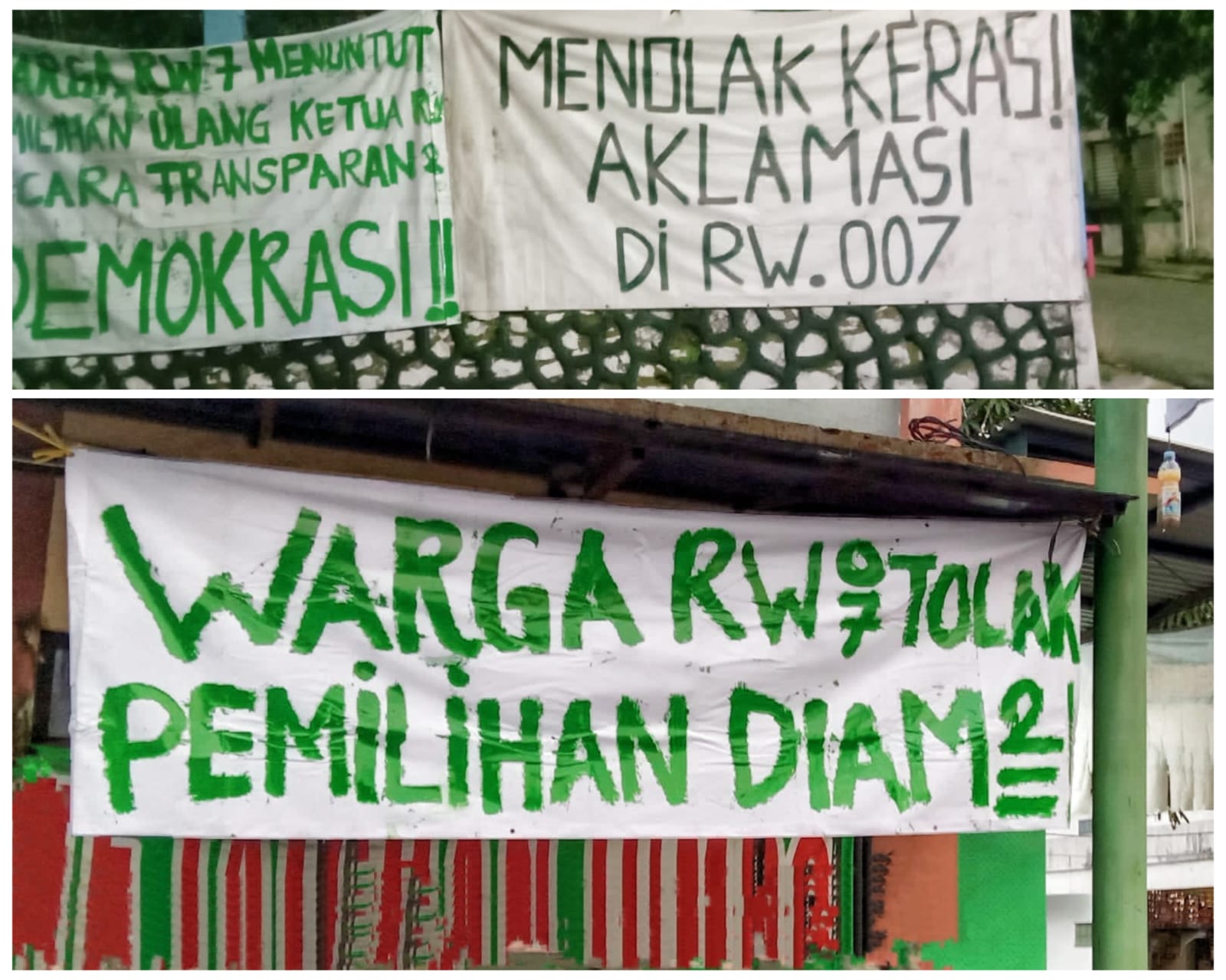 Spanduk dan poster yang menyatakan penolakan terhadap hasil pemilihan yang dianggap mencederai demokrasi terlihat bertebaran di wilayah Total Persada RW 07 Kelurahan Gembor.