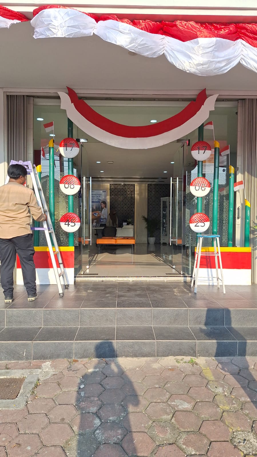 Seluruh pegawai turut berpartisipasi aktif dalam proses menghias, mulai dari pemasangan bendera, umbul-umbul, spanduk bertema kemerdekaan, hingga ornamen kreatif yang menampilkan semangat perjuangan dan kebanggaan sebagai bagian dari bangsa Indonesia.