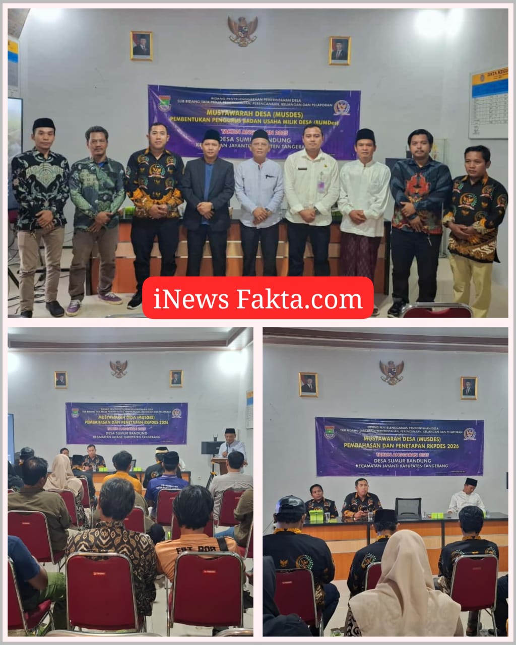 INEWSFAKTA.COM  | Kabupaten Tangerang –  Pemerintah Desa Sumur Bandung, Kecamatan Jayanti, menggelar Musyawarah Desa (Musdes) tahun anggaran 2025 yang dirangkaikan dengan pembentukan pengurus Badan Usaha Milik Desa (BUMDes). Kegiatan berlangsung di aula kantor Desa Sumur Bandung pada Jumat (17/10/2025).