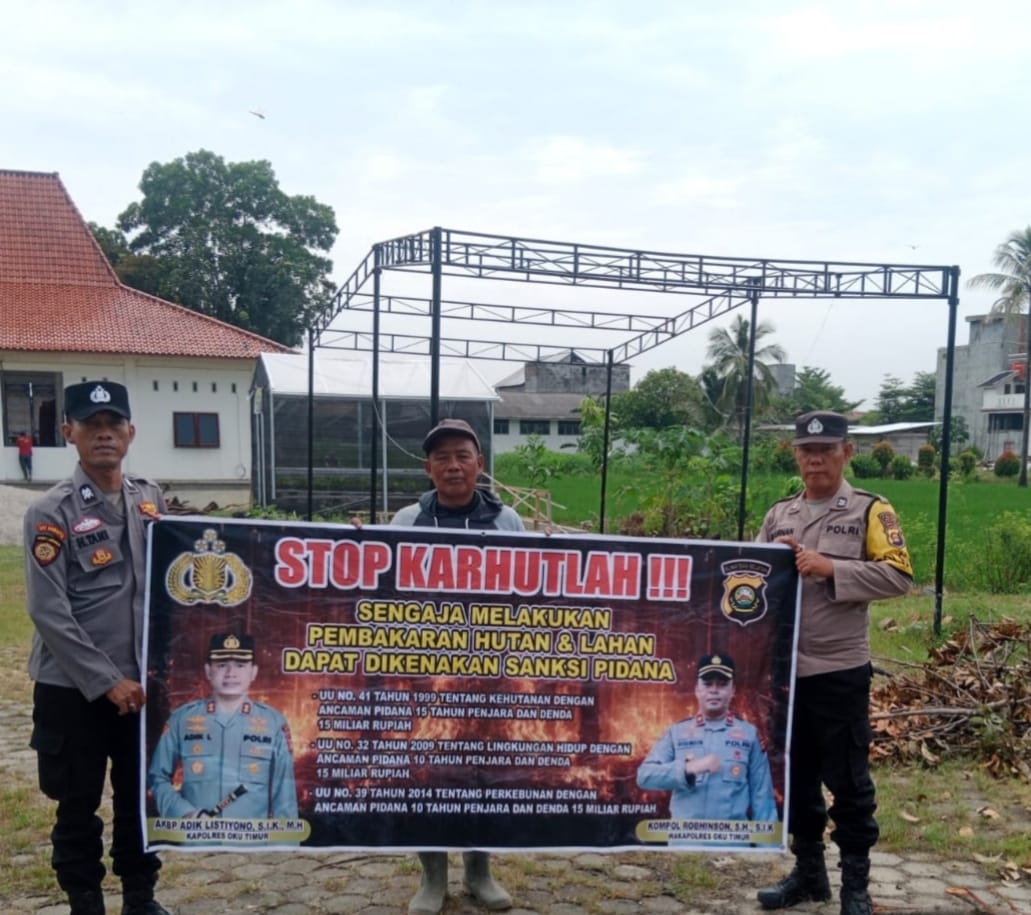 INEWSFAKTA.COM | Oku Timur – Polsek Buay Madang, Polres Oku Timur, Polda Sumsel, gencarkan sosialisasi dengan memasang Spanduk dan himbau warga untuk tidak membakar hutan Dan lahan (Karhutla) di Desa Anyar Kecamatan BP Bangsa Raja. Mengingat rawan terjadi Karhutlah saat ini, Kapolsek Buay Madang perintahkan anggota untuk mensosialisasikan ke warga masyarakat setempat agar tidak melakukan pembakaran hutan dan lahan dikarenakan ada ancaman pidana dan denda bagi yang melakukan pembakaran, Rabu (24/12/2025).