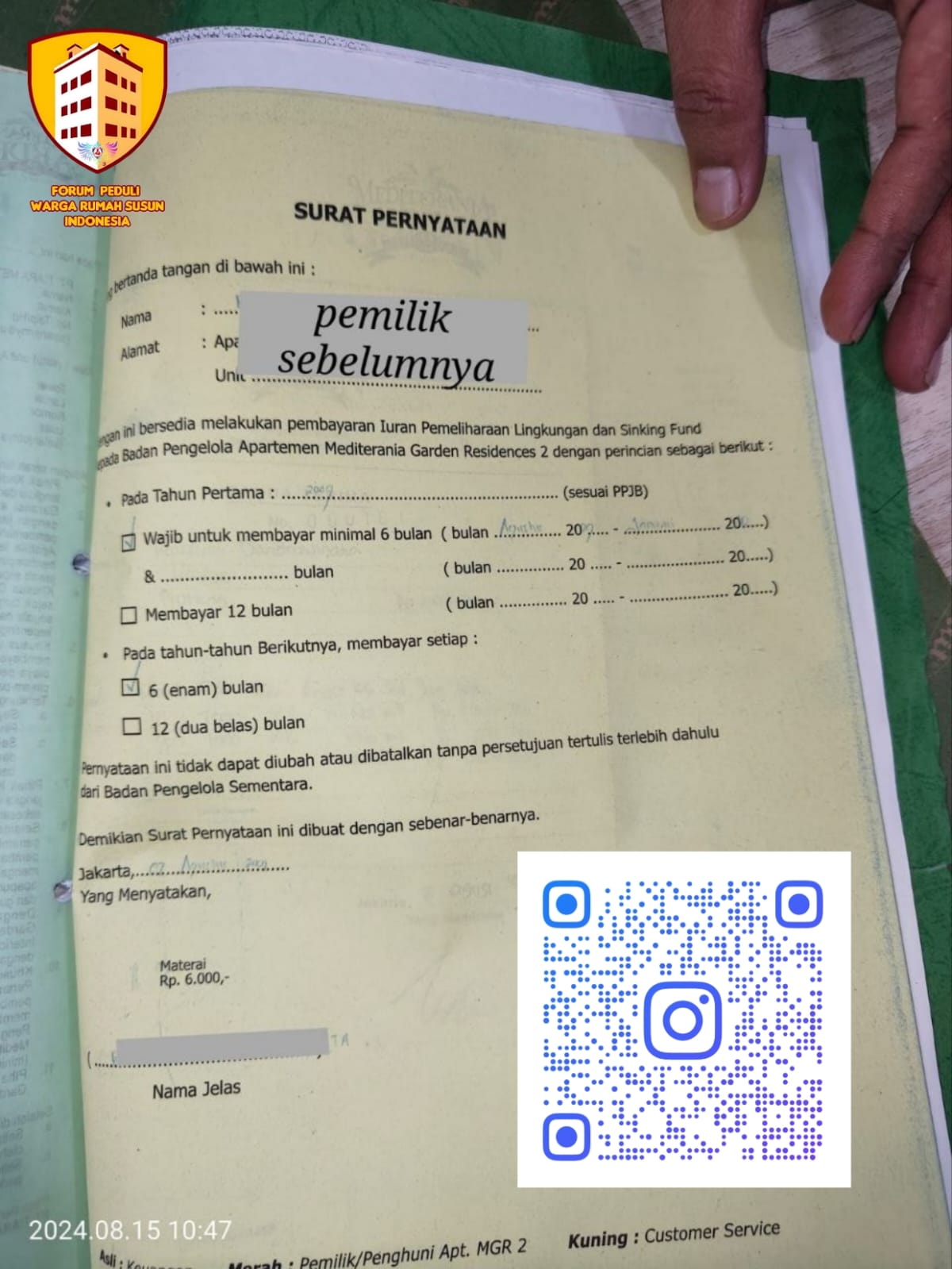 Lebih problematis lagi, surat pernyataan bermeterai tahun 2008 tersebut hingga tahun 2024 dan diduga hingga kini , masih dipakai oleh pihak pengelola sebagai dasar untuk menekan warga ketika terjadi keterlambatan pelunasan iuran pemeliharaan lingkungan (IPL). Dokumen lama itu kembali dimunculkan setiap kali muncul tunggakan, seolah-olah memiliki kekuatan hukum permanen. Padahal, dalam banyak kasus, kewajiban lain seperti biaya air dan listrik tercatat selalu lunas. Artinya, yang dipersoalkan bukanlah pemanfaatan layanan dasar, melainkan pemaksaan kepatuhan finansial atas satu jenis iuran tertentu dengan bersandar pada dokumen sepihak yang lahir dari situasi hukum yang sudah berubah.