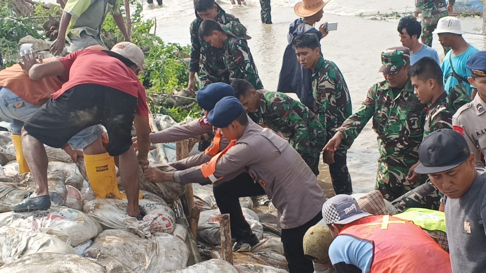 Hingga sore hari, proses penguatan tanggul darurat masih berlangsung sebagai upaya bersama dalam penanggulangan bencana dan perlindungan masyarakat di wilayah Muara Gembong, Kabupaten Bekasi.