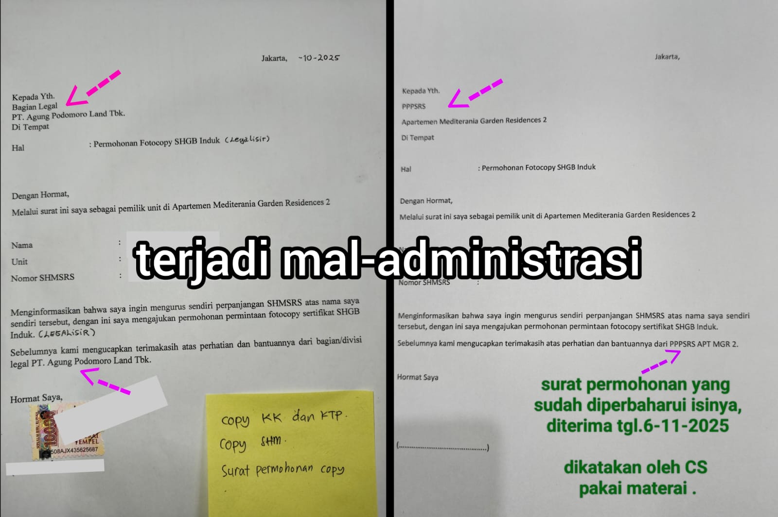 Pada 31 Oktober 2025, warga mendatangi kantor pengelola MGR.2 sebanyak 2 kali untuk meminta copy legalisir SHGB induk serta surat rekomendasi P3SRS untuk unit ” E “.